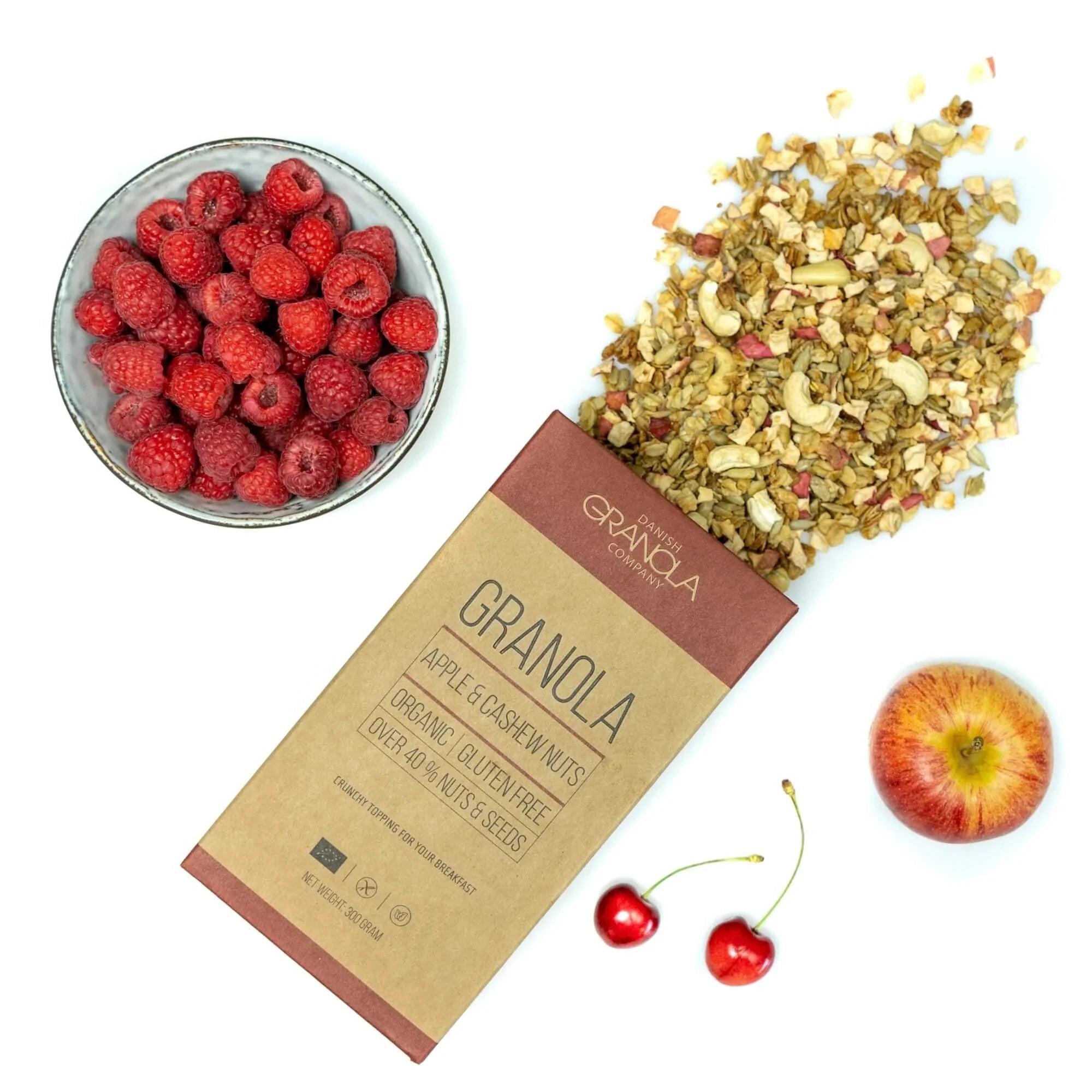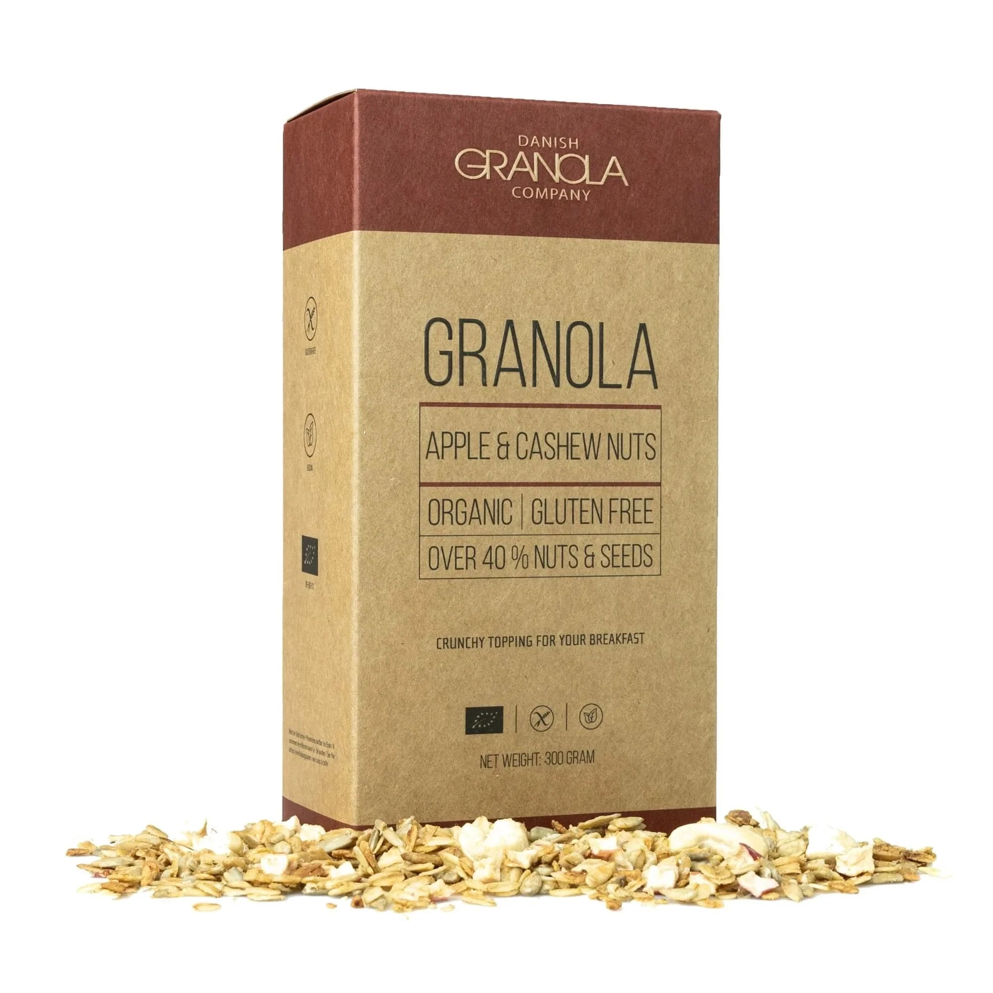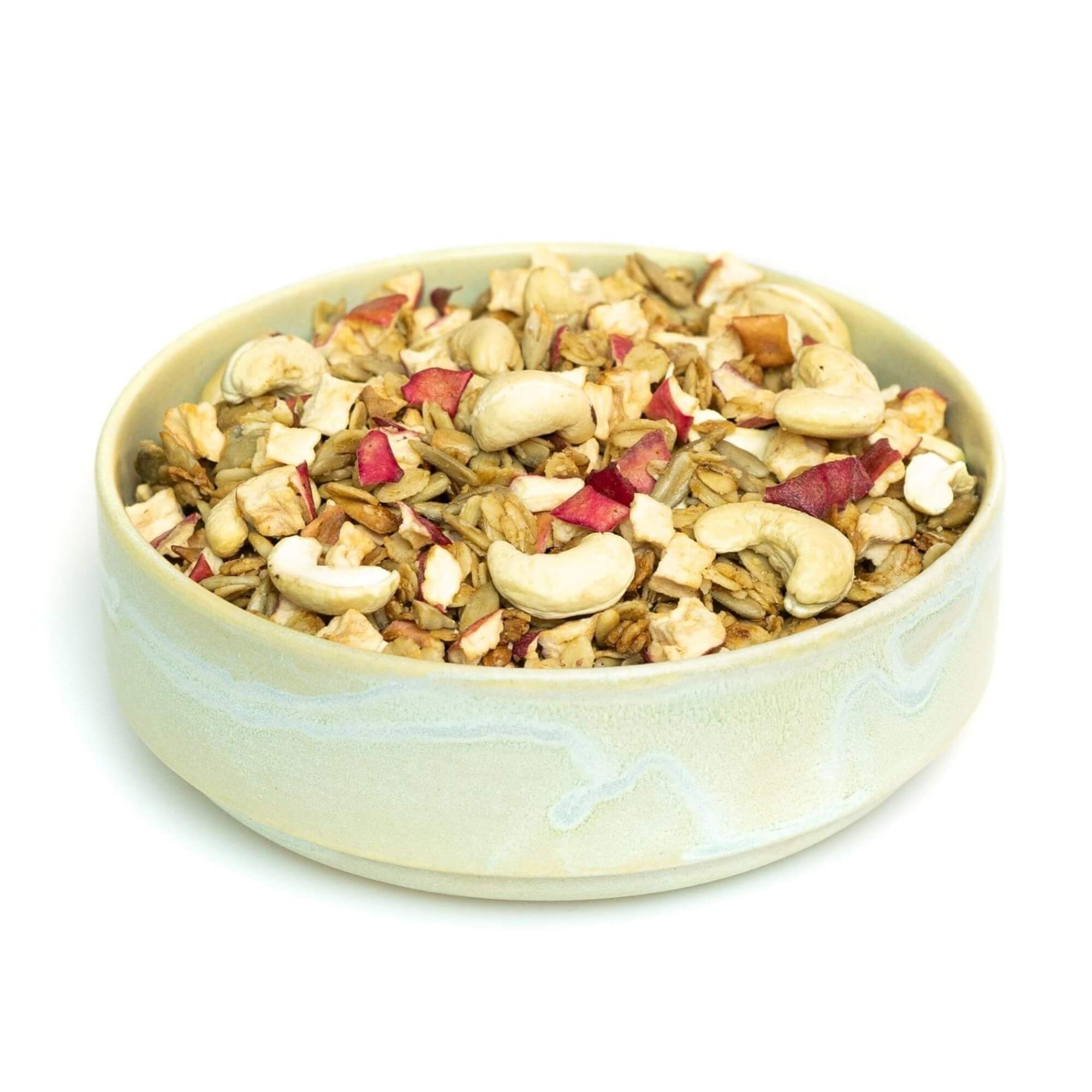 Нашата гранола е истинска експлозия от вкусове, благодарение на вкусната комбинация от сушени ябълкови семки и кашу. Ябълковите семки добавят естествена сладост, а кашуто впечатлява с мекия си, гладък вкус. И най-хубавото: тази гранола е съставена от 40% ядки и семена. Естествено, всички съставки са 100% био и без глутен. Независимо дали е като топинг за кисело мляко или просто самостоятелно като лека закуска – тази гранола поставя нов стандарт.